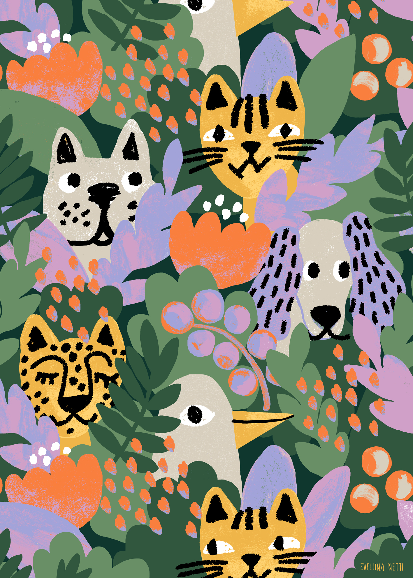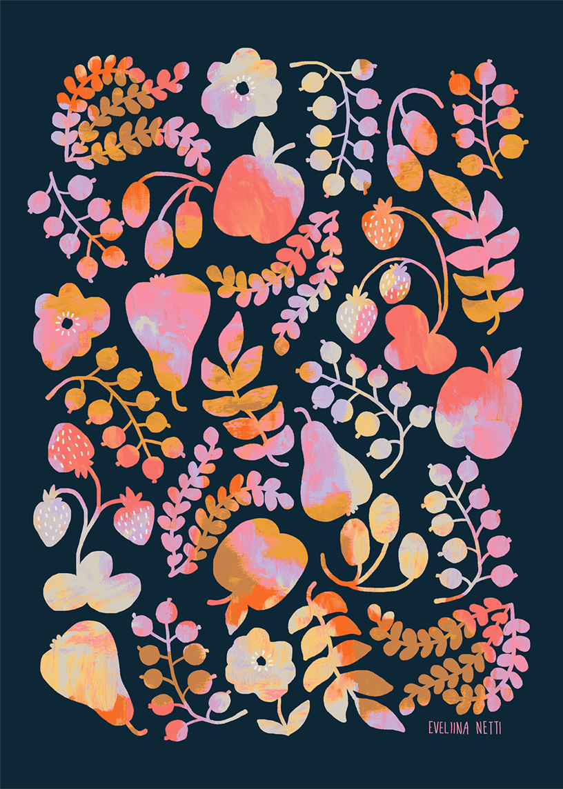 Eveliina Netti on Helsingissä asuva kuoseihin ja kuvittamiseen erikoistunut suunnittelija, joka valmistui taiteenmaisteriksi Aalto-yliopistosta 2019. Hänen leikkisä ja värikäs tyylinsä yhdistelee satumaisuutta, huumoria ja graafisuutta, ammentaen inspiraatiota arjen erikoisista sattumuksista ja luonnosta. Erityisesti Eveliinaa kiehtovat tarinat ja sadut, jazz-musiikki, lasten erikoinen maailma, sekä kasvit ja eläimet, jotka usein löytävätkin tien hänen kuvituksiinsa. Töissään hän tykkää luoda tunnelmia yhdistellen käsinmaalattuja pintoja, rohkeita muotoja, sekä heleitä värejä. Eveliina työskentelee monipuolisesti eri tekniikoilla, sekä käsin että digitaalisesti piirtäen ja maalaten. Hänen iloinen ja mutkaton elämänasenteensa heijastuu hänen työskentelytapoihinsa, mikä tekee yhteistyöstä mukavaa, suoraviivaista ja rentoa. Hän pitää huolen siitä, että projektit valmistuvat sovitussa aikataulussa, tilaajan toiveita kuunnellen.