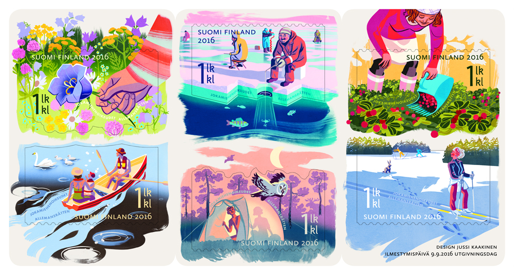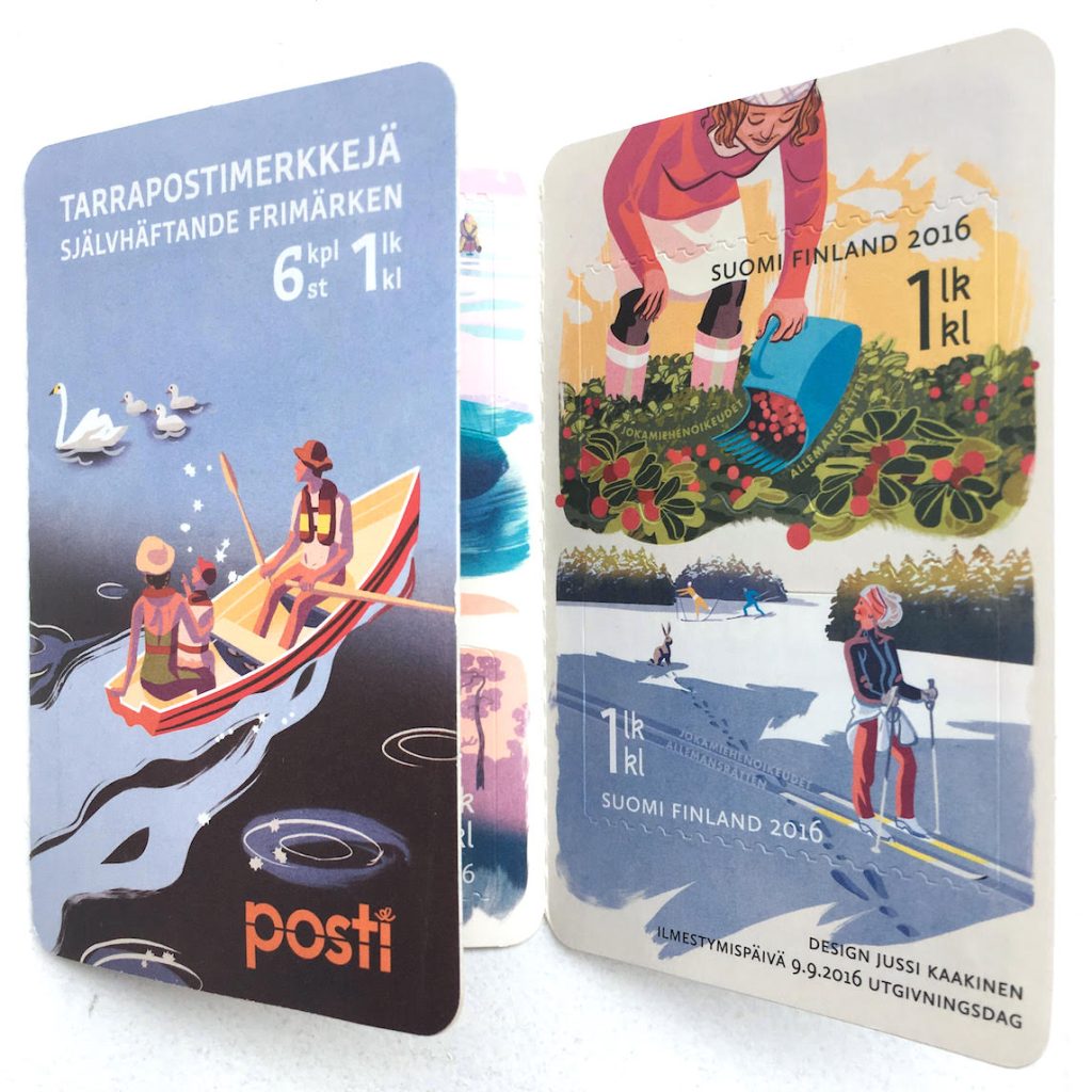 Postin julkaisema kuuden postimerkin vihko ilmestyi syksyllä 2016, ja niitä julkaistiin 500 00 kappaleen painos. Värikkäisiin merkkeihin on kuvattu ihmisten puuhastelua luonnossa. Edustettuina ovat eri vuodenajat ja suomalaisille rakkaat ulkoilma-aktiviteetit: telttailu, pilkkiminen, marjastus, hiihtäminen ja soutelu.