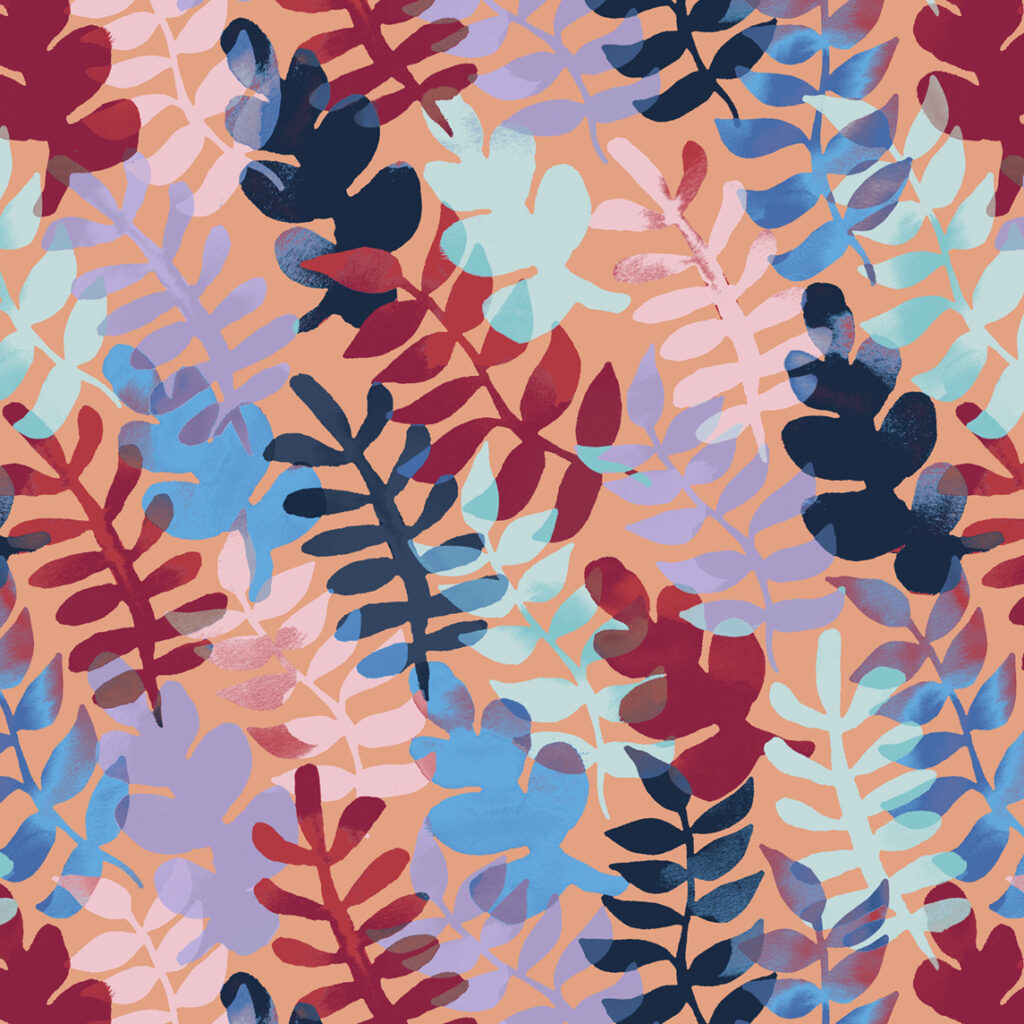 Kuosien tekoprosessi riippuu siitä, että onko kyseessä asiakkaalle kustomoitu tilauskuosi, vai teenkö kuosin ihan omista lähtökohdista. Jos kuosi on tilaajalle, tutustun ensin huolella tilaajan briiffiin, brändiin ja tyyliin, kuosin käyttötarkoitukseen, mahdolliseen malliston teemaan, moodboardiin ja värikarttaan. Tältä pohjalta alan ideoida, etsin mahdollisesti inspiraatiokuvia, valitsen tähän mallistoon sopivan tekniikan ja tyylin ja alan luonnostella, joko paperille tai suoraan koneella. Kun minulla on kuosin elementit kasassa, alan rakentaa niistä kuosiraporttia (eli kuinka kuvio toistuu) koneella. Piirrän lisää, ja testailen kuosin skaalaa ja raportin toimivuutta. Tarkistan tilaajan mielipiteen ja lopuksi viimeistelen kuosin siivoamalla raportin puhtaaksi ja teen kuosista muutamia eri värityksiä joista tilaaja voi valita mieleisen.