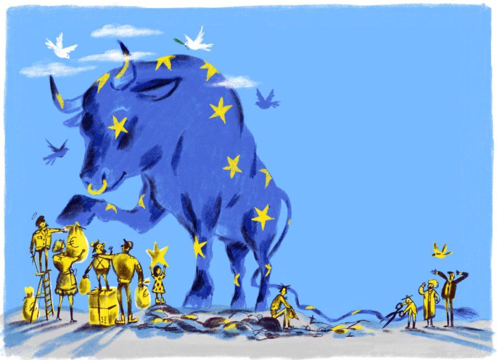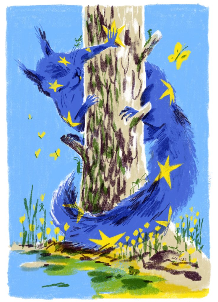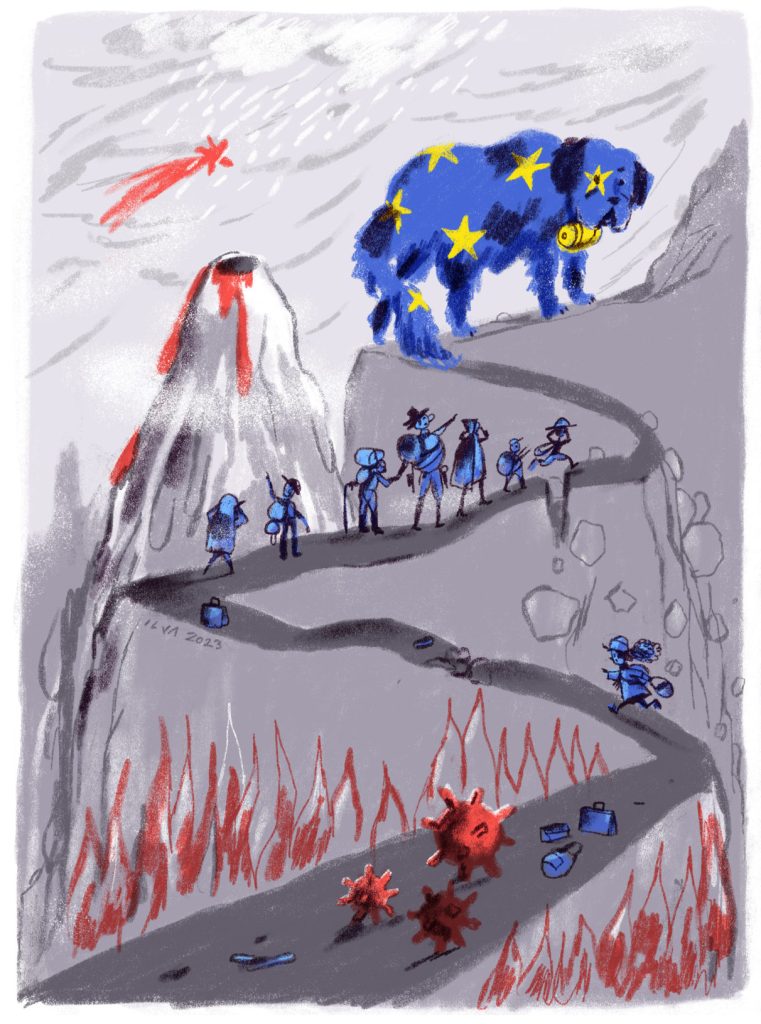 Napa Agencyn pitkäaiakaisimmista kuvittajista, lehtikuvituksen taituri Ilja Karsikas tarttui haasteeseen, kun Helsingin yliopiston Yliopistolehti pyysi häneltä kuvituksia niinkin tärkeästä aiheesta kuin Euroopan Unioni ja sen haasteet. Toiveena oli, että lehtikuvitukset myös projisoitaisiin Helsingin yliopiston Tiedekulman betoniseinälle ohjelmasarjan  ”Minne menet, maailma?” aikana 24.1.-3.2.2023.