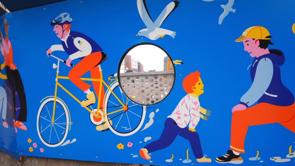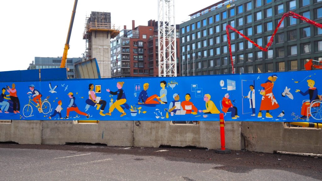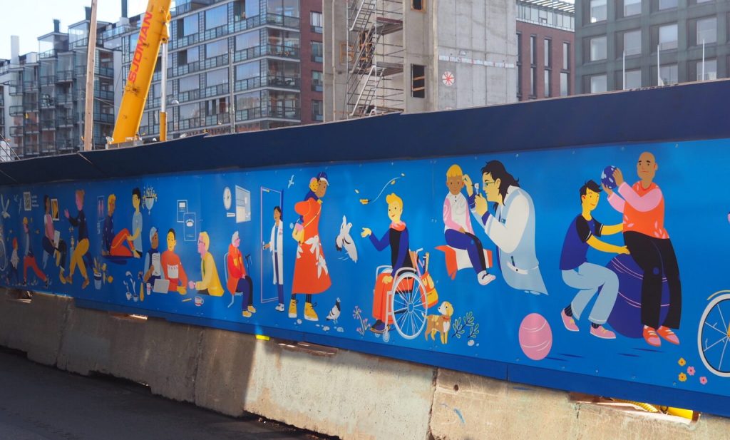 Helsingin kaupungin ja Napa Agencyn yhteistyönä syntynyt Riku Ounaslehdon kuvitus on yksityiskohtia pursuava ja tunnelmaltaan lämmin. Työmaa-aita on poikkeuksellinen sillä se näyttää kuvituksen keinoin pilkahduksen alueen ja valmistuvan kohteen tarkoituksesta. Teos kuvastaa niin kaupunkilaisten kuin terveyden ja hyvinvoinnin ammattilaisten näkökulmia.