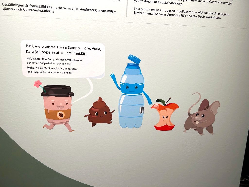 Napa Agencyn kuvittaja Riku Ounaslehto on luonut näyttelyyn värikkäitä ja hauskoja hahmoja, jotka viihdyttävät niin lapsia kuin aikuisiakin. Riku Ounaslehdon näyttelyä varten kuvittamat maskottihahmot – Herra Sumppi, Lörö, Voda, Kara ja Rööperi-rotta – johdattavat sinut seikkailulle Helsingin jätemaailman syvyyksiin!